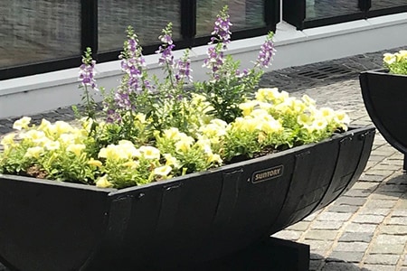 たっぷりと水を与えて、完成です。 山崎蒸溜所では、ガーデンプランター舟型63のほか、椀型のプランターも使って季節の花と緑でお客様をお迎えしています。 ご来場の際には、ぜひ花々とプランターもお楽しみくださいね!
