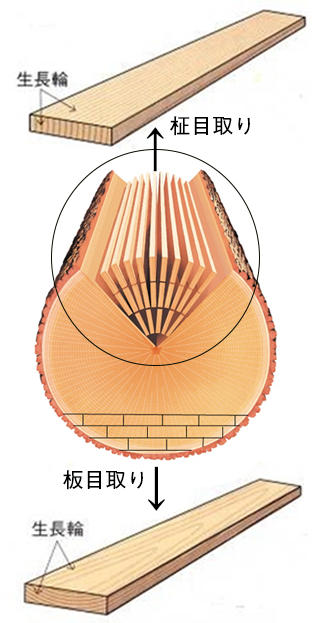 木材の製材の方法には、柾目(まさめ)取りと板目(いため)取りの2種類があり、切った丸太を水平に切り出したものを「板目板」、丸太の中心から放射線状に材を切り出したものを「柾目板」と呼びます。