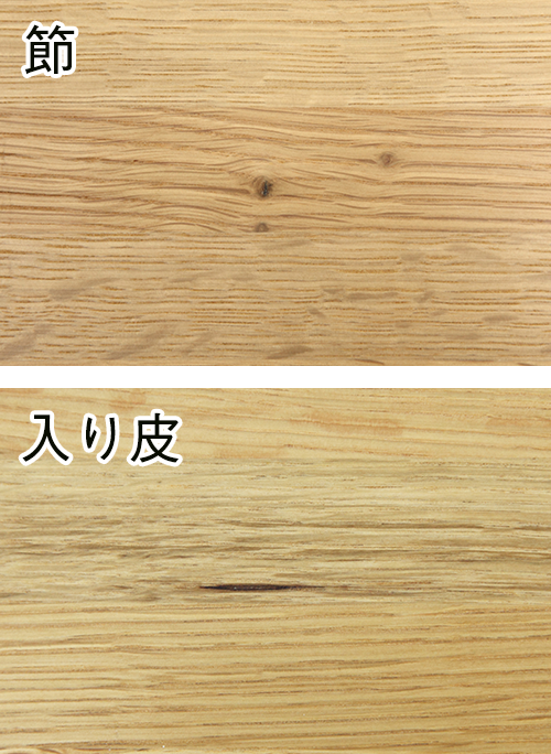 「ナチュラルマーク」には、木が生長する過程で、天候の影響などに起因する成長輪(=年輪)のほか、 木の色調の濃淡や、 小枝が幹に包み込まれて痕になった「節(ふし)」、傷ついた 樹皮を巻き込むように成長したなごりである「入り皮」などがあります。